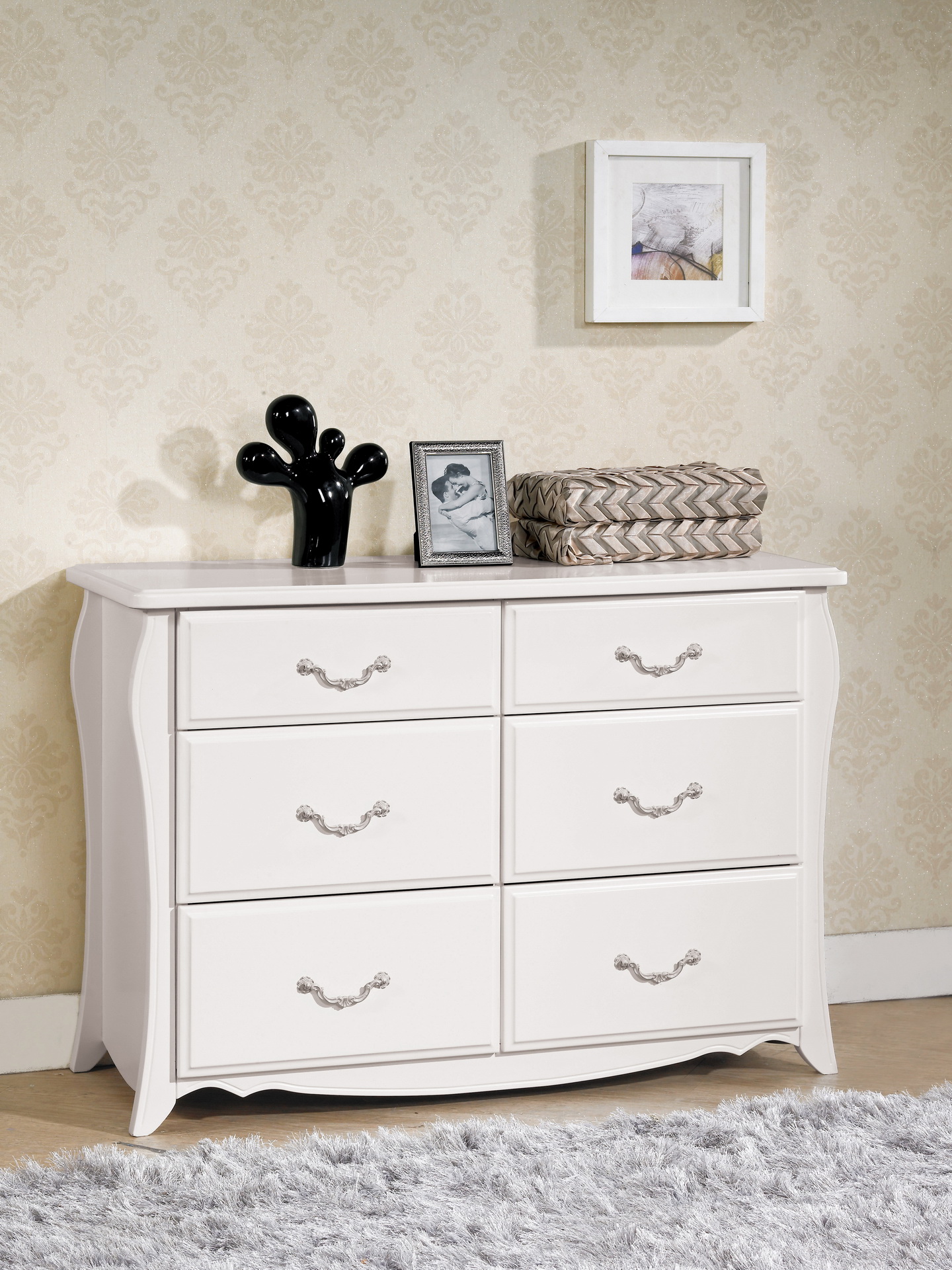 商品編號 DCM 647-6 商品名稱 仙朵拉3.5尺六斗櫃 商品尺寸 寬106x深45x高75.5CM 側板 波麗符合國際標準低甲醛防蛀木心板 桌面25mm.MDF材質三層噴漆 材質 正面實木 加18mm.MDF三層噴漆 塗裝 採用優麗坦(環保漆)經紅外線處理.耐磨. 耐防黃烤漆 抽屜 鋼珠滑軌抽屜底版採用5mm合板 背板 美背式處理 手把 古典雙色烤漆手把