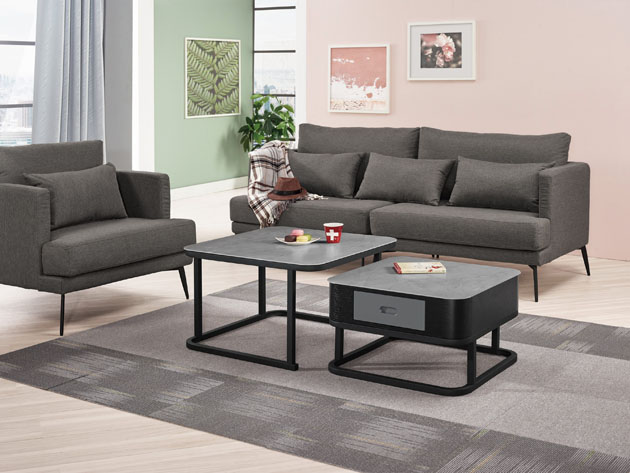商品編號 DCM 745-1 商品名稱 安琪拉組合玻璃茶几(全組)(岩玻) 商品尺寸 (大)寬70深70高44.5CM (小)寬60深60高37.5CM 商品解說 材質 高級MDF全烤式材質 桌面 岩玻.仿岩燒石強化玻璃 抽屜 鋼珠滑軌 桌腳 防鏽五金烤漆處理 塗裝 採用PU耐磨,耐水塗裝