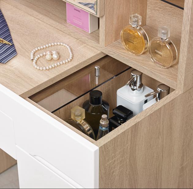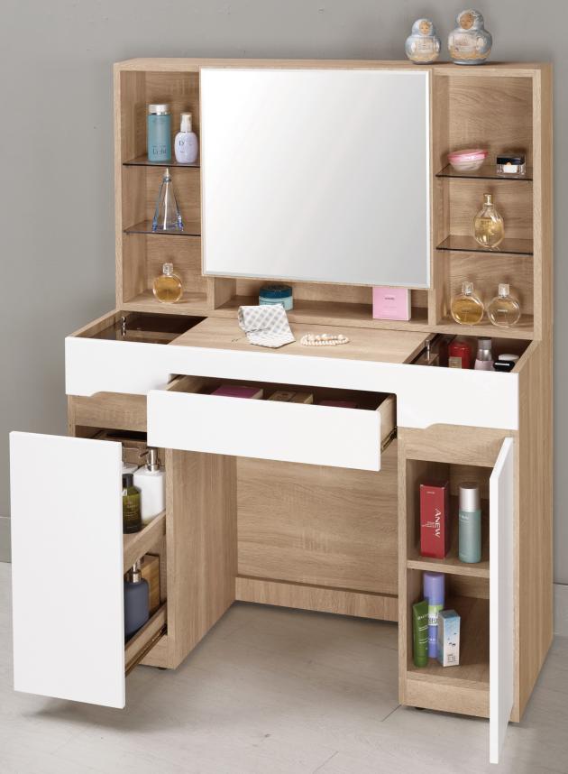 商品編號 DCM 635-2 商品名稱 伯妮斯3.3尺化妝台(全組) 商品尺寸 寬100x深42x高134CM 材質 採用符合國際標準低甲醛防祝木心板+ MDF全包式材質 塗裝 採用優麗坦.耐磨.耐水塗裝 抽屜 台灣製造高級鋼珠滑軌 背板 崁入式美背式處理 腳座 實木烤漆腳座